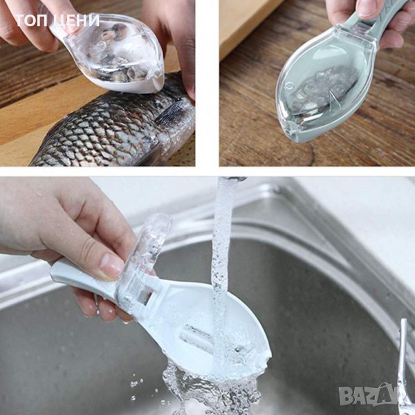 Отстраняването на люспите е много лесно благодарение на конструкцията – пластмасов нож влизащ под рибената люспа. Отстранените люспи се събират в контейнера. Почистването му след това е много лесно и бързо чрез голямото и лесно за обслужване капаче. Прозрачният капак осигурява много добра видимост, за количеството ма отпадъка. Удобна дръжка във форма ма рибена опашка