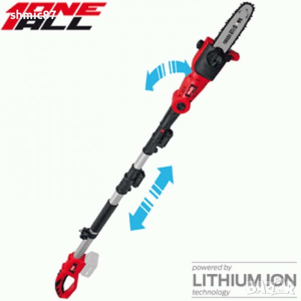 VALEX Италия е от серията акумулаторни машини работещи с една универсална Li-ion 18V батерия с различен капацитет / 1.5 / 2.0 / 3.0 / 4.0 / 5.0 / Ah. С този верижен трион вие може с лекота да режете клони на височина приблизително до 4 метра при дебелина на клона 18 см. Три позиционно регулиране / накланяне / на режещата глава на 0°-15°-30° градуса за по – лесно рязане при работа. Олекотен телескопичен алуминиев удължител. Превключвател за защита срещу случайно стартиране – Бърз обтегач на веригата без използване на инструменти – Автоматично смазване на веригата – Маслен резервоар с отчитане външно ниво – Закрепване на главата и бързо удължаване на тръбата, без използване на инструменти – Мека дръжка – Защита на шината и веригата при транспортиране с твърда обвивка –