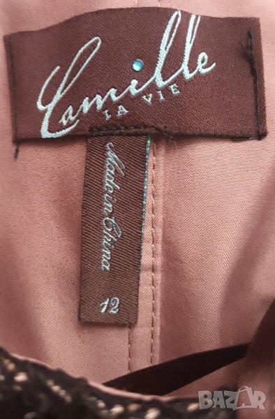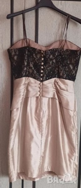 Официална рокля. Интересен модел, с панделка с камъчета на талията. Гърба се разкопчава с цип. Копчетата са имитация за красота. Комбинирана сатен с дантела в горната част. Горната част е тип бюстие, с подплънки. Без презрамки. Обличана е 2 пъти по повод. Размери подмишница 45 см, талия 40 см, ханш 50 см, дължина от горе от бюстието 82 см
