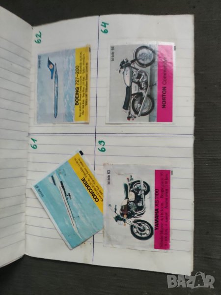 Продавам картинки от дъвки Bi Bib .84 броя от 1 до номер 84 включително .Залепени ни са някога на тетрадка .5-6 са отлепени Лепилото е остаряло и предполагам повечето доста лесно могат да се отлепят.Една от отлепените е облепена с хартия
