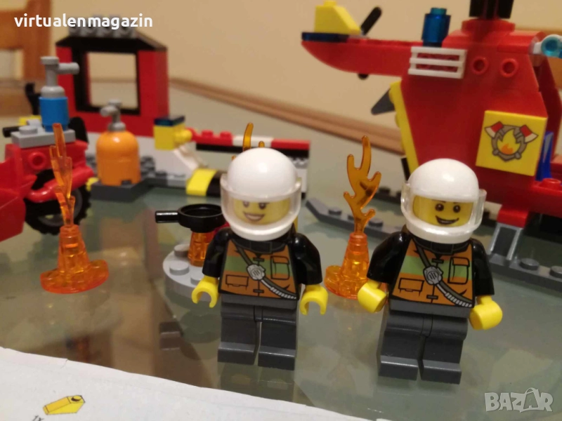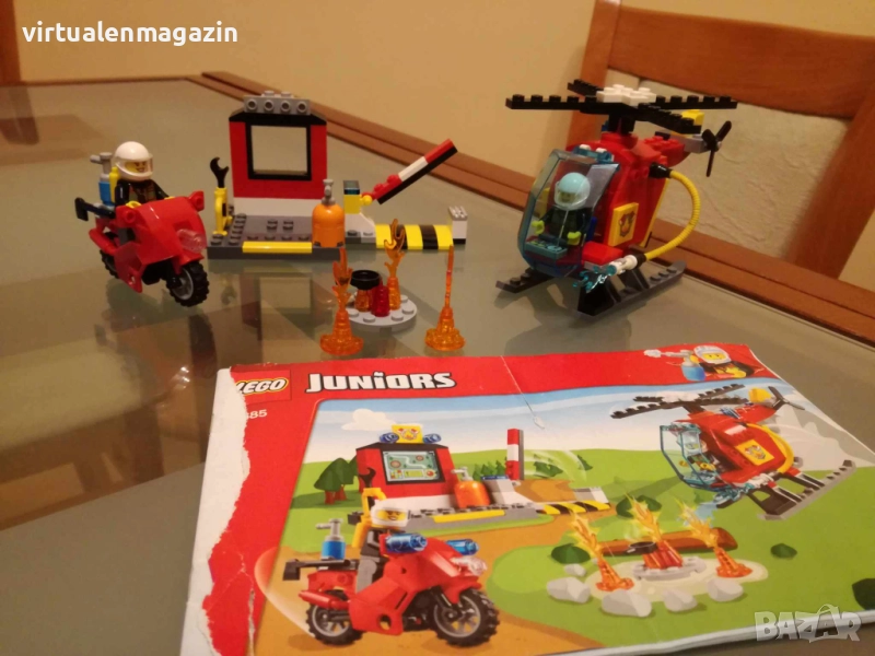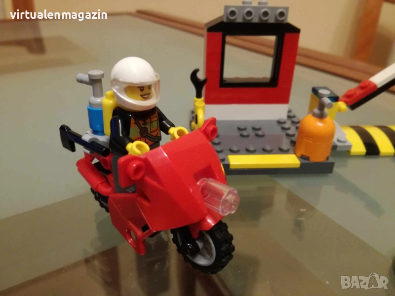 Има хеликоптер, мотоциклет, малка сграда с бариера и огнище. 2 фигурки на пожарникари - мъжка и женска.