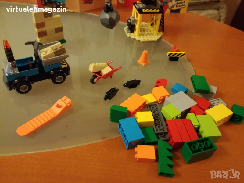 , конус, строителни аксесоари и много тухлички с които да строите различни допълнителни неща според въображението си!