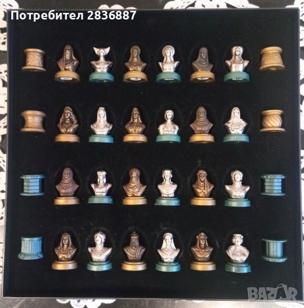 Игра на ДАМА - МАВРИ И ХРИСТИЯНИ. Частите са бюстове на жени (арабки и християнки), изработени от олово върху пластмасова основа. Приблизителна височина на частите: 3,5 см. Всички фигури имат номер в долната част на основата, тези числа варират от 1 до 16 корелативно (и двете са включени), а останалите имат числата: 18 - 20 - 22 - 24 - 26 - 28 - 30 и 32 Играта идва в оригиналната си кутия, която включва пластмасов капак. На гърба на кутията е дъската, за да може да се играе (приложена снимка). Размер на кутията: 30 х 30 см. Той е от марката MD - Metales Deportivos. Пластмасовото покритие е малко захабено и има следи от употреба.