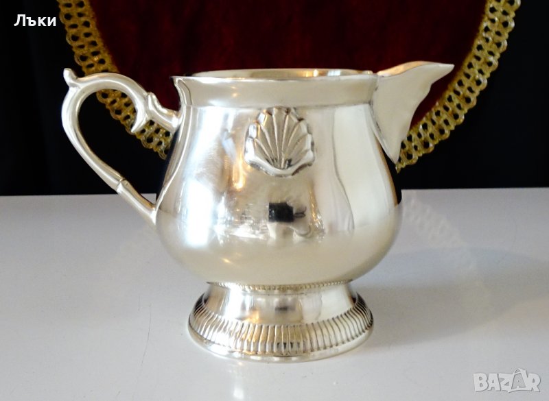 Старинна английска кана за ракия,мляко,сметана,майсторска ръчна изработка от масивен бронз.Отвън е посребрена с висока проба сребро.Декорирана с красив релеф и ефектно извита дръжка.Височина 10 см.,диаметър 10 см.,тегло 290 гр.Вместимост 250 мл.