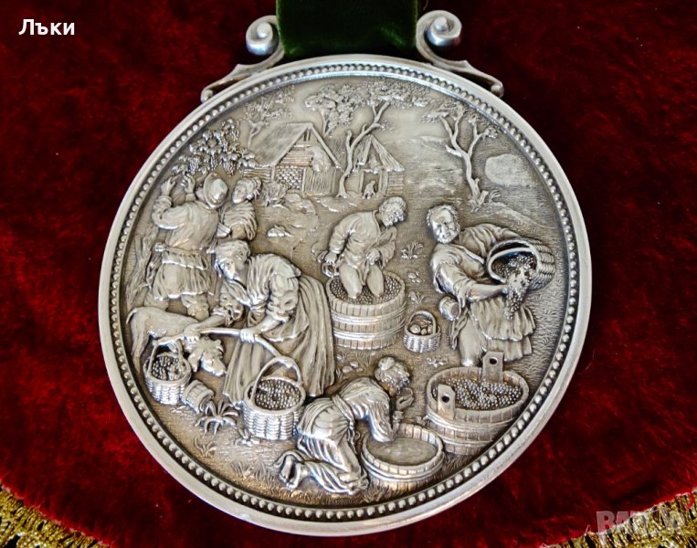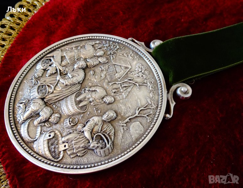 Западно Германски плакет,медал,пано с окачалка на фирмата SkS,маркиран.Плакета е ръчно изработен от 95% калай и 5% сребро,декориран с релефна картина Гроздобер.Диаметър 11.5 см.,височина с окачалката 26.5 см.,тегло 140 гр.