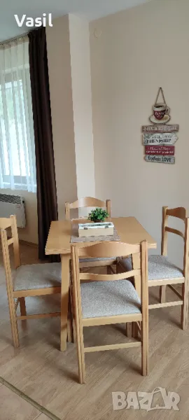 Кухня оборудвана с абсорбатор с активен въглен, хладилник, керамични котлони, микровълнова печка, тостер, ел.кана за вода, прибори и съдове за хранене).