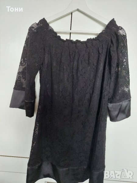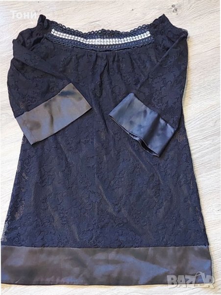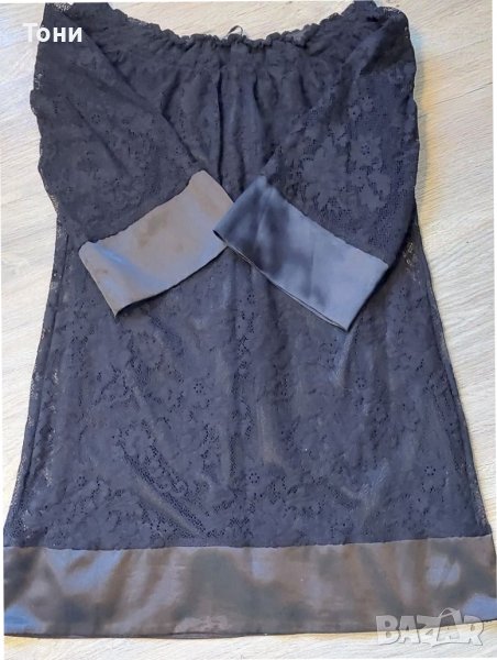 Дамска официална рокля ластична дантела и сатен. Свободен модел. По етикет размер С но става и за М. Бюст едностранно 50 см. Дължина на роклята 80 см. Ръкава е 7/8. Роклята е с подплата. Има еластичност. Няма забележки.