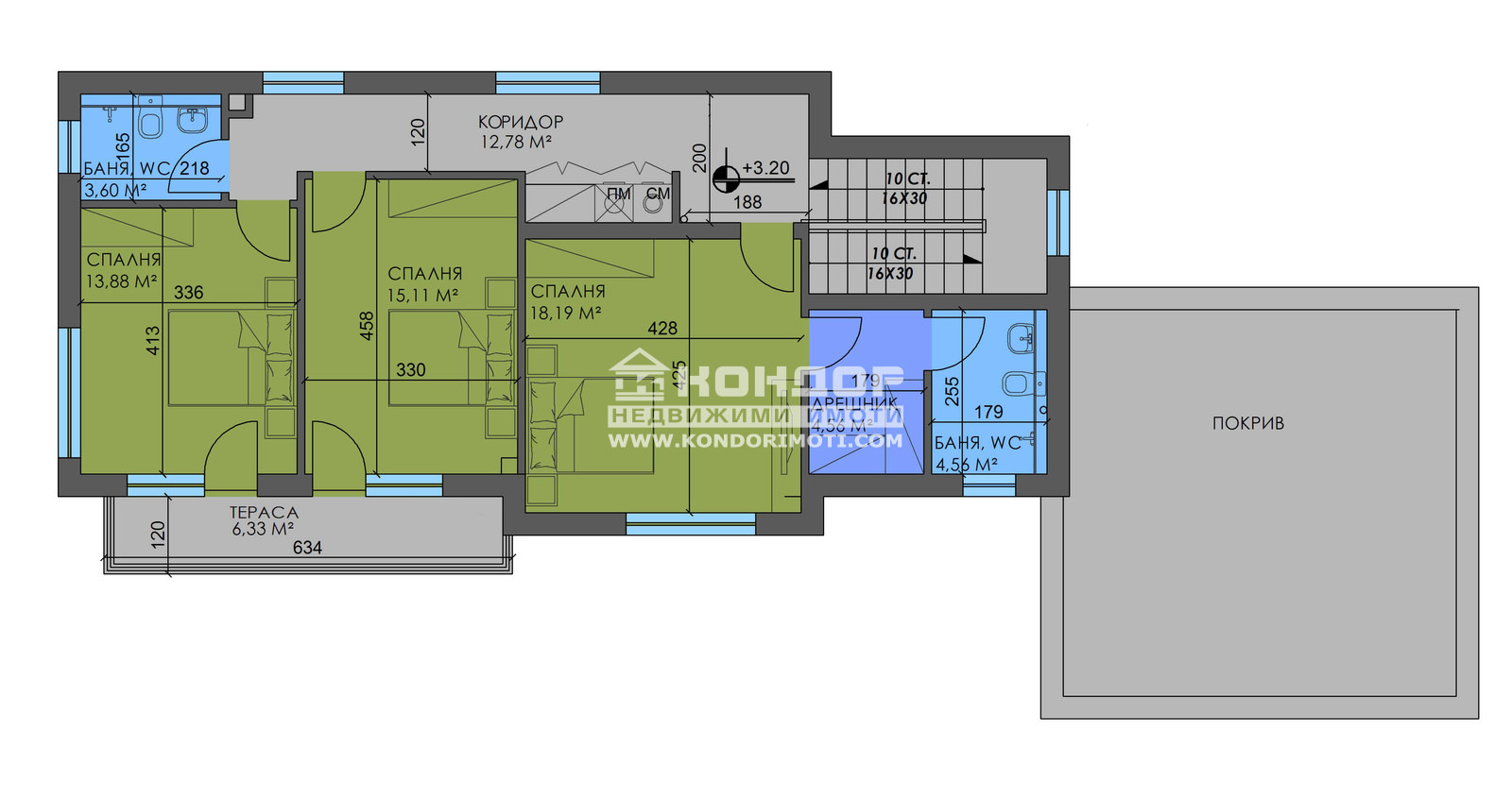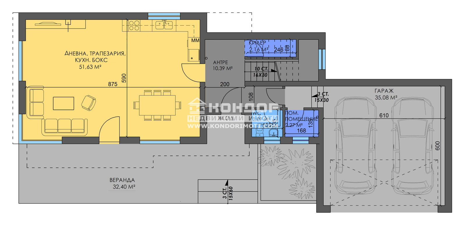 РАЗПРЕДЕЛЕНИЕ: Къщата е Разположена на две нива с общо застроена площ от 250 кв.м. в двор с площ от 500 кв.м., проектирана с модернистична визия и концепция, залагаща на увеличени светли пространства, високи тавани, френски прозорци създаващи усещане за простор и свобода. Къщите са с достъп от асфалтов път, вързани към Вик с права вода и с канализация !!! На първо ниво е разположена просторна и функционална дневна с площ от 52 кв.м., която ще създаде желания комфорт и уют, оформена на кътове: място за Камина, кът за мека мебел с TV секция, трапезарна част и отделен светъл кухненски бокс с излаз на покрита веранда с площ от 32кв.м., широко входно антре с място за гардеробна, тоалетна с мивка, килер и двоен гараж с топла връзка. На второ ниво са разположени три спални, като родителската 18кв.м. разполага със собствена баня с тоалетна и дрешник, две детски спални, съответно 14 и 15кв.м. и втора баня с тоалетна, която обслужва двете детски стаи и перално помещение и една тераса.