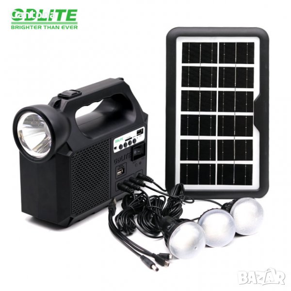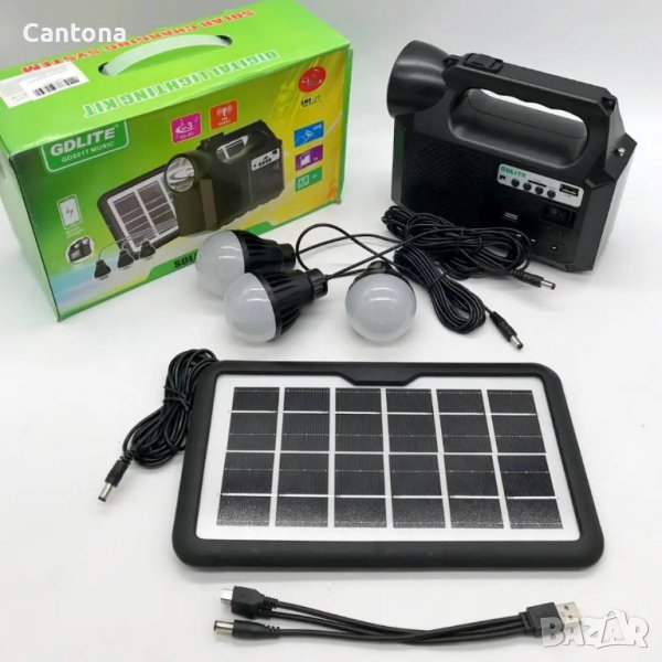 В комплекта: соларен панел, мултифункционално устройство GD-8017 Music, три LED лампи с кабели и ключове за LED осветление, USB кабел с комплект зарядни за най-разпространените модели портативни устройства. Това е устройството, което ще ви осигури нужната автономност при продължителен престой на място без електрификация.