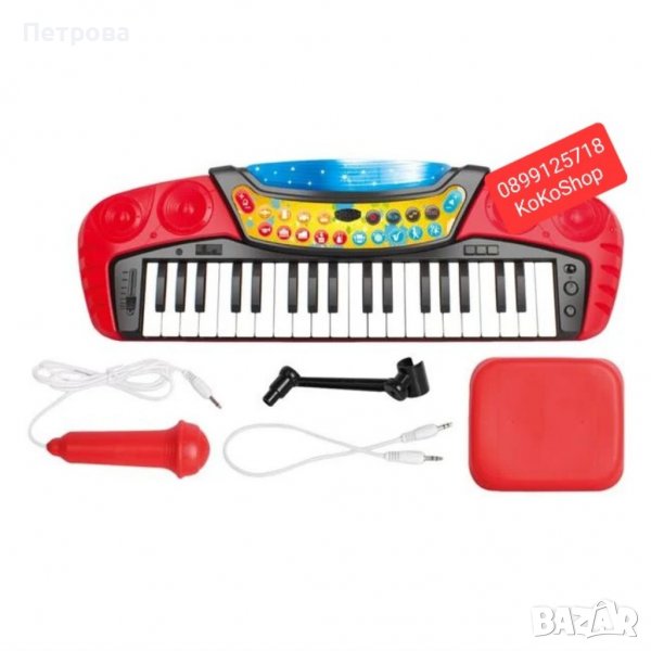 Детско пиано с микрофон и столче. Пианото е с 37 клавиша и светлинни ефекти. Има контрол на темпото, звук на барабан, възпроизвеждане на специални звукови ефекти, контрол на силата на звука и демонстрационни песни. Има бутон за включване/изключване, избор на инструмент и танцови ритми. . Работи с 3 броя батерии,тип АА (не са включени в комплекта)