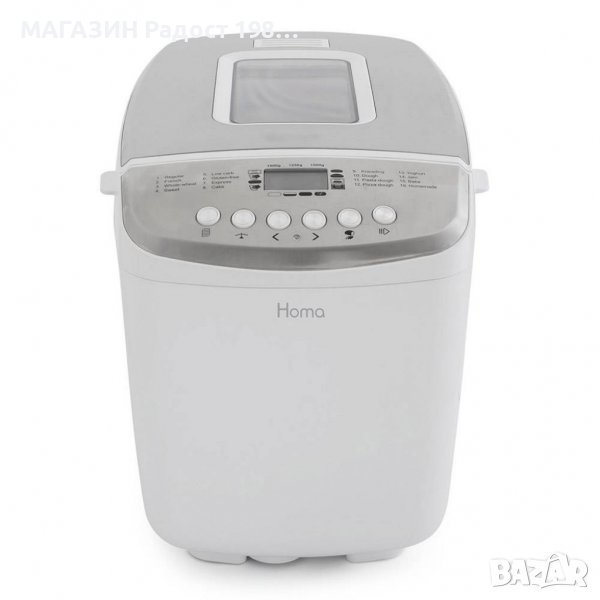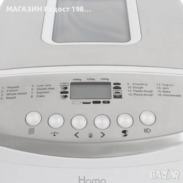 16 автоматични програми за работа - основна, френски, пълнозърнест, сладък, нисковъглехидратен, безглутенов, експресен, кекс, месене, тесто, тесто за паста, тесто за пица, йогурт, конфитюр, печене, ръчна настройка.