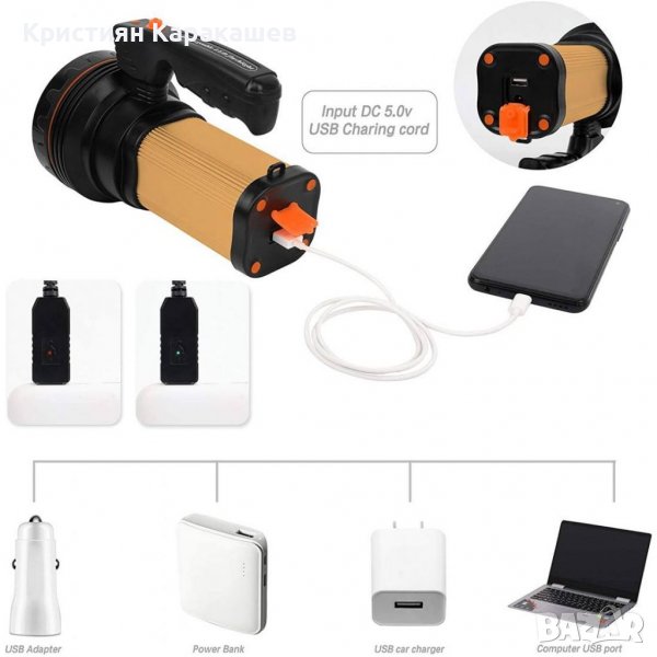 Прожекторът се зарежда като се включи зарядното към мрежата, а другия му извод - в куплунга в задната част на прожектора