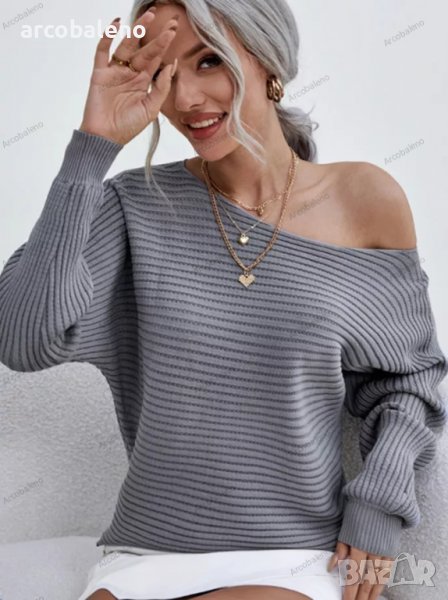 Дамски моден едноцветен секси свободен пуловер с дълъг ръкав и кухи външни рамена