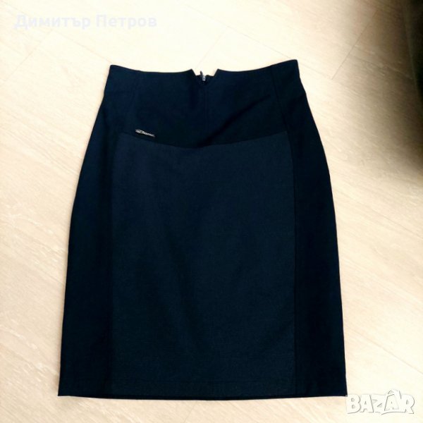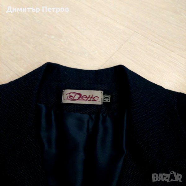 Продавам чисто нов дамски елегантен костюм Денс - българска колекция, тъмно син цвят, сакото е леко вталено размер 40, полата е с висока талия размер 38.