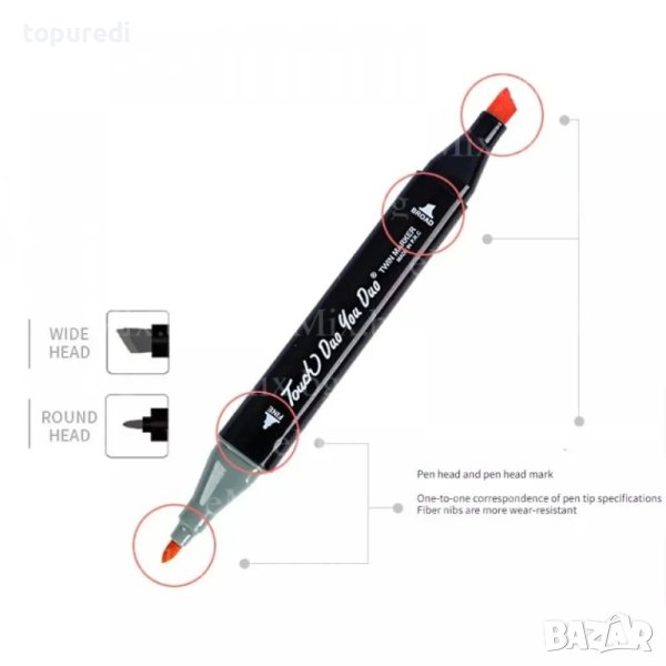 Маркерите са с ергономичен дизайн за по-удобен захват. Иновативният и издръжлив дизайн на писците гарантира, че те дълго време ще запазят твърдината си и няма да се износят. Изработени са от висококачествен пластмасов материал , който е нетоксичен и издръжлив. Комплектът се състои от 48 броя маркери с различни цветове. В единия си край притежават тънък, а в другия – скосен писец. Благодарение на двата си писеца с различна форма, маркерите позволяват на художниците и дизайнерите по-широк диапазон от дебелини на линията. Потокът на безмирисното мастило е контролиран, което предотвратява евентуалното му разтичане или размазване. Мастилото е на алкохолна основа и не разтваря вече принтирано тонер мастило, което дава възможност за ярко оцветена творба върху принтирани повърхности. Също така дават възможност на творците да използват много и различни техники като им предоставят по-голяма свобода в изразяване на техните идеи. Арт маркерите са подходящи за илюстратори, аниматори, за хората, занимаващи се с архитектурно рендиране или интериорен дизайн.