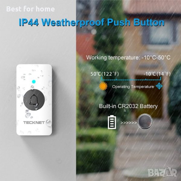 • Безжичният звънец разполага с обхват до 150 м, гарантирайки, че няма да пропуснете посетител, дори ако сте в друга стая или на друг етаж