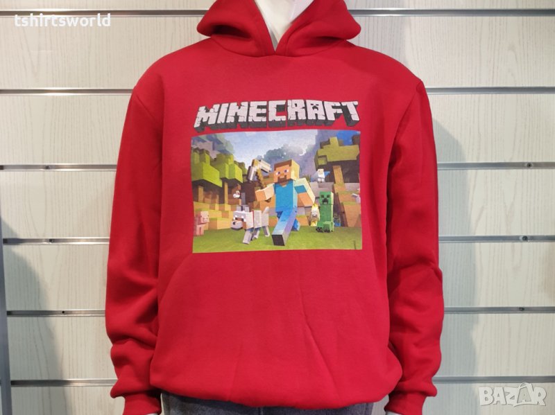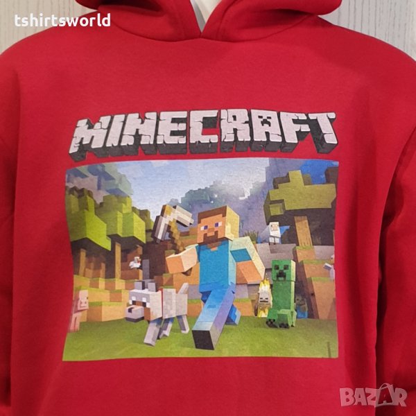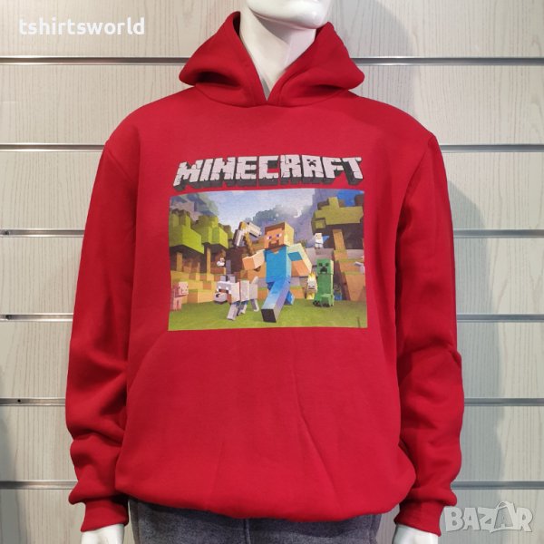 Страхотен нов мъжки суичър в червен цвят с качулка и дигитален печат MINECRAFT. Произведен в България под марката PRINTEX от 100% висококачествен памук, което го прави изключително топъл и желан от нашите дългогодишни клиенти. Моделът е подходящ за пролетния и есенно-зимният сезон, има ластични маншети на китките и ханша, запазващи топлината. Меката подплата и свободната кройка го прави изключително удобен за нашите малки клиенти.