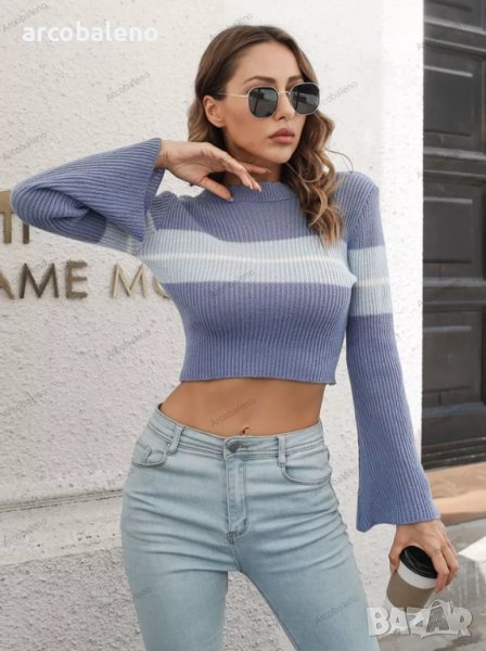 Дамски изрязан пуловер с контрастни райета, 3цвята