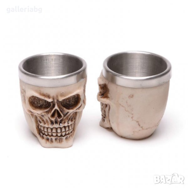Сувенирна чаша във формата на череп, изработена от полирезин и метална вътрешна част.