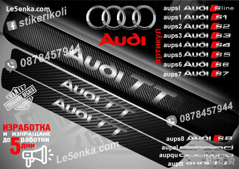 Изработват се от карбоново фолио. Прeдназначени са за автомобили които нямат декоративни прагове. Размерите са 50х5 см. за праговете на предните врати и 30х5 см. за праговете на задните врати - за четириврати автомобили. За двуврати автомобили камплекта е от два прага и размера е 65х5 см. При поръчка посочете варианта като артикулен номер, вашите имена, телефонен номер и адрес на офис на Еконт за доставка.