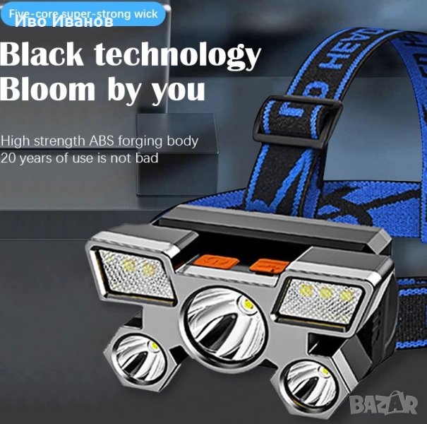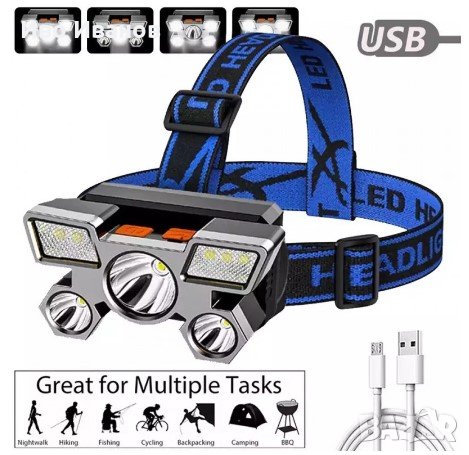 Акумулаторен челник 5 LED диода с отлично осветяване. Удобен е за планински преходи, къмпинг,