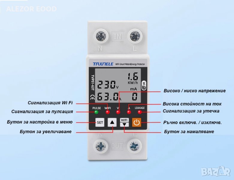 - Регулируема защита от пренапрежение 1A-63A (по подразбиране: 63A)