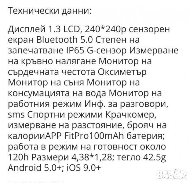 Продавам два смарт часовника + едно зарядно за двата. Работят отлично! Липсват им каишките само, продава се това което е на снимките! Имат доста функции, може да ги свържете през блутута само! Или с приложението им от Google play, Може за фон да си задавате различни часовници, теми, както и лични снимки! за фон на часовника. Но! Когато инсталирате приложението, и му дадете нужните разрешения. Кръвното го мерят с леки отклонения 😉 като цяло страхотни часовници, ако имате същия, но е счупен! Страхотен заместител са, продават се двата на тази цена + зарядно. Батериите им държат между 4-5 дена. Не се продават по отделно или само зарядно!!! На пазарлъци давам 10 - 20лв. Няма да отговарям. Батериите им не съм ги зареждал от половин година! Неизвестно им е състоянието? Работят си перфектно! Но не мога да гарантирам колко издържат вече. Обявата е само за София! И лично предаване. При интерес пишете, оставете си номер за връзка 📲и ще се свържа с вас. Ако ще купувате ми звънете, в противен случай на глупости няма да отговарям!!! Как работели, как се свързвали, ама работят ли и т.н. Напълно работещи са! Бяха нови! използвани 6 дена. Защо нямат каишки и кутии си е моя работа, не отговарям на такива въпроси.