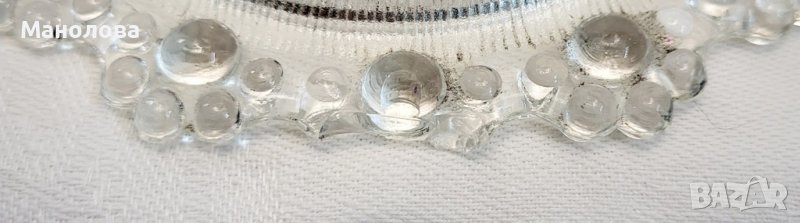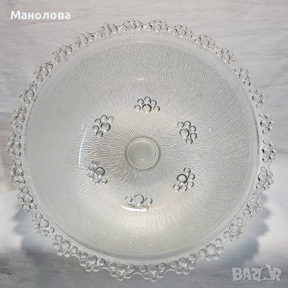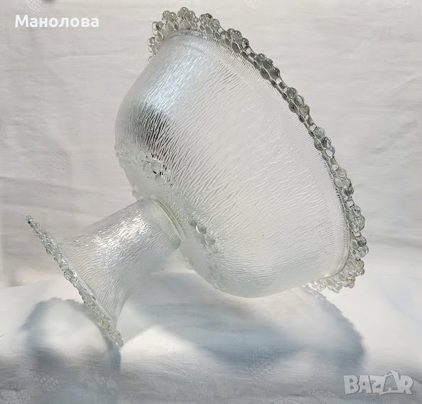 Матираното стъкло се изработва чрез обработка с абразив или киселина. Украсена с множество ръчно полагани топчета под формата на цветя, фруктиерата е в добро ретро състояние. Произведена 70-те години на миналия век. Има само един дефекта в основата, моля разгледайте снимките!