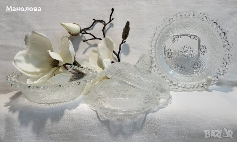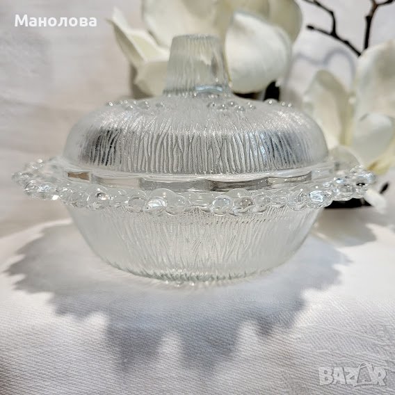 Две прекрасни купички с капак, захарница или бонбониера изработени от пресовано, матирано стъкло.