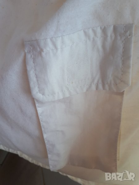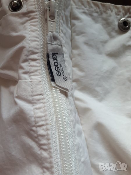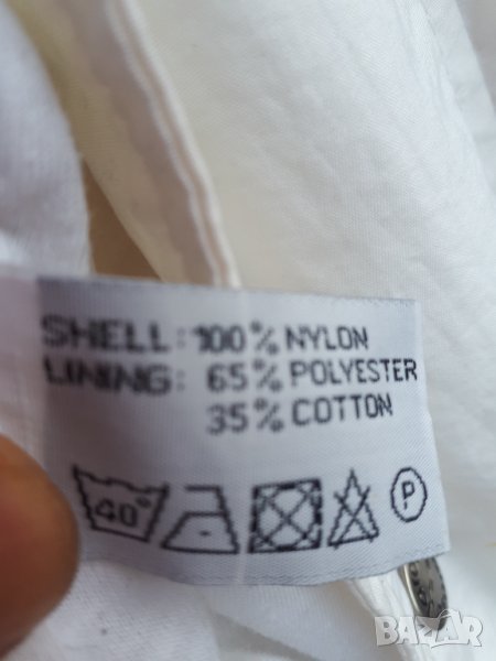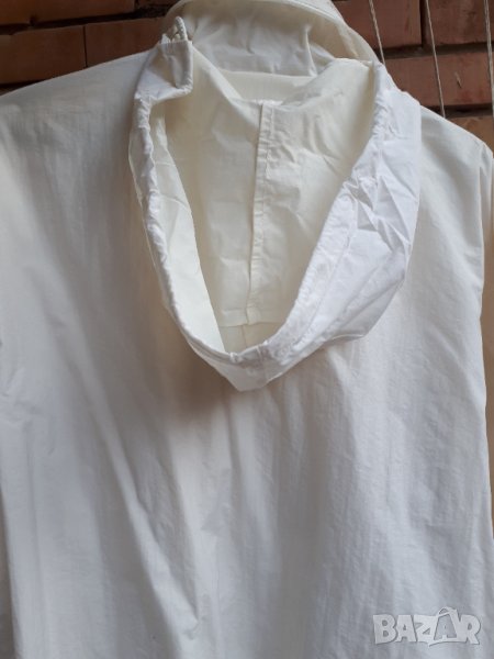 Бяло тънко мъжко шушляково яке La Rose с подплата, качулка прибираща се в яката, вътрешен джоб и друг за телефон. По етикет размер Л. Гръдна обиколка 66 см. едностранно, рамене 60 см., ръкав 61 см., рамо 21 см., дължина 78 см. Без забележки.