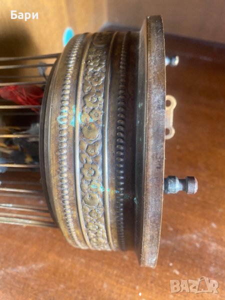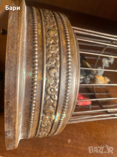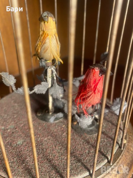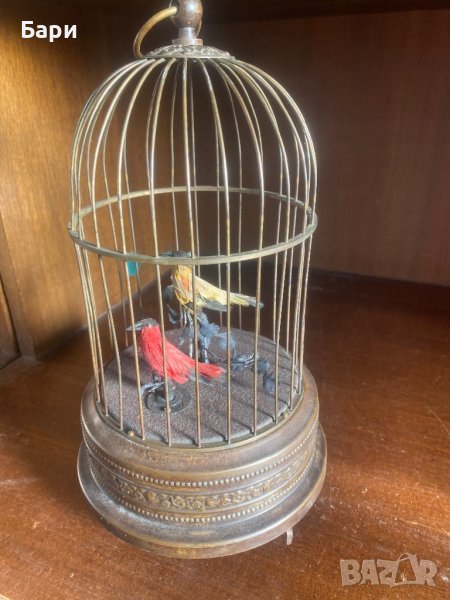 Продавам механична клетка за птици , от 50-60те години на миналия век, произведен в Германия, включва чифт цветни пернати птици, кацнали върху месингова стойка със зеленина и основа от кадифе .Долната страна съдържа фиксирания ключ за навиване и лоста за включване и изключване.При навиване на ключа и при включен лост, птиците започват да махат с опашка, въртят глави и започват да чуруликат весела птича песен. Клетката е в много добро състояние и е функционална.Механизма на птиците работи и има сила на звука излизащ от долната страна на клетката.