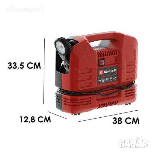 Безмаслен преносим компресор EINHELL TC-AC 190 OF SET. Сила на засмукване 190 л. / мин. и налягане 8 бара. Притежава ергономичен дизайн - компресорът може да се използва навсякъде и по всяко време, спестява място. Задвижва се от двигател без масло, който няма нужда от обслужване. Има много приложения - надуване на автомобилни гуми, велосипедни гуми, топки, надуваеми басейни, въздушни матраци. Електрическият портативен компресор е подходящ за издухване на детайли, различни повърхности, корпуси и двигатели. Доставя се с пистолет за помпане, манометър, комплект накрайници и маркуч с дължина 3 метра. Разполага с практично отделение за съхранение на аксесоарите. Технически характеристики: безмаслен, изискващ минимална поддръжка; лек, ергономичен и компактен дизайн; лесен за транспортиране; спестява място за съхранение; възможни са множество приложения за сгъстен въздух до 8 бара; включен 3 м маркуч за сгъстен въздух с бързо свързване; удобно отделение за съхранение на аксесоари, интегрирани в корпуса. Технически параметри: мрежова връзка - 220-240 V | 50 Hz; максимална мощност на двигателя - 1100 W; обороти на двигателя - 15 000 об. / мин.; скорост на помпата - 3750 об. / мин.; мощност на засмукване - 190 л. / мин.; изходна мощност при 0 бара - 165 л. / мин.; изходна мощност при 4 бара - 83 л. / мин.; изходна мощност при 7 бара - 55 л. / мин.; максимално работно налягане - 8 бара; брой цилиндри – 1. Окомплектовка: пистолет за помпане на автомобилни гуми с манометър - 1 брой; комплект накрайници - 8 броя; маркуч 3 метра - 1 брой