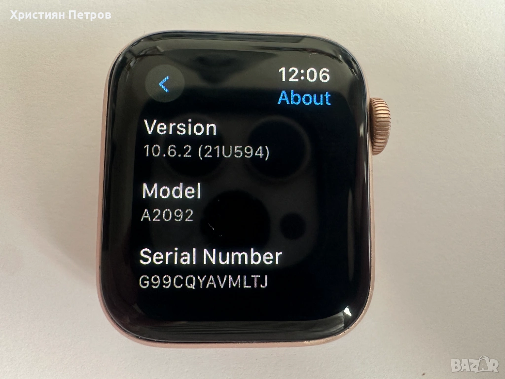 Продавам Apple Watch Series 5 Gold Aluminum Case с Pink Sand Sport Band с размер 40 мм, розов на цвят с модел MWV72BS/A GPS версия A2092. Всички функции по часовника работят перфектно, състоянието на часовника е като ново, няма никакви забележки или следи от употреба, което може да се види на снимките. Инсталирана е последна верси iOS - 10.6.2. Здравето на батерията е на 88%. Закупен е от iStyle на 31.07.2020 г. и няма остатъчна международна гаранция. Продава се пълен комплект с кабел, зарядно, оригинална спортна гумена каишка и кутия.