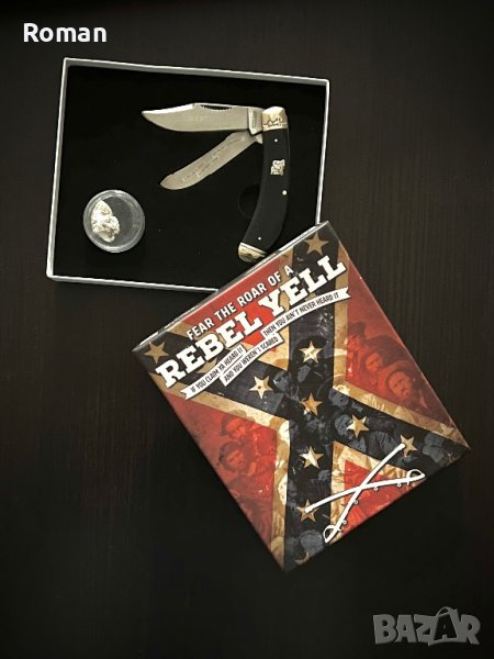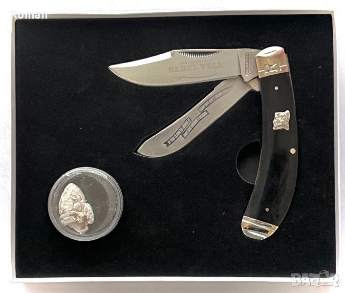 Сгъваем джобен колекционерски ловен нож. Полирано острие с гравиране. Дръжката е кост. Ограничена серия. Кутия за подарък. Кутията съдържа и оригинален куршум от бойното поле на Гражданската война в САЩ. Дължина на острието 8,5 см. Дължина на сгънат нож 10,0 см. Това е прекрасен подарък за мъж за всякакви празнични поводи