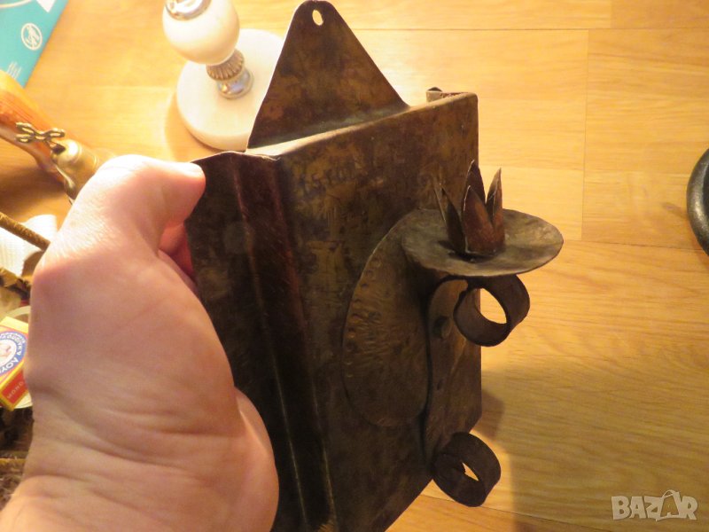 Старинен метален свещник с свещ от 70те с надпис - занаятчийска красива изработка за твоята механа