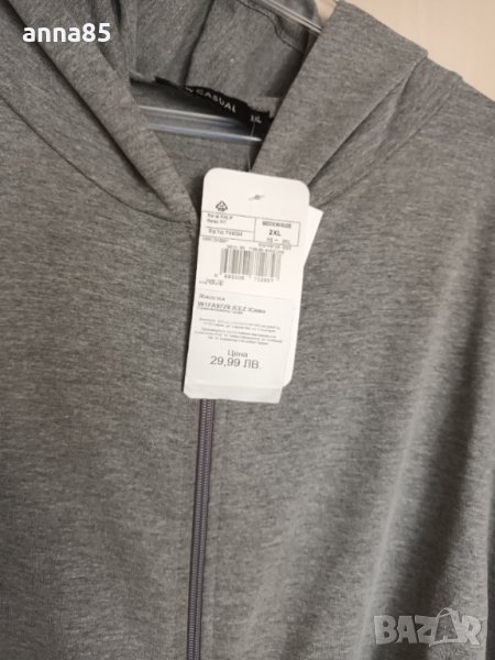 Сив къс суичър с цип и качулка, дължина 56см, гръдна и ханш 120см. Цена 25лв.