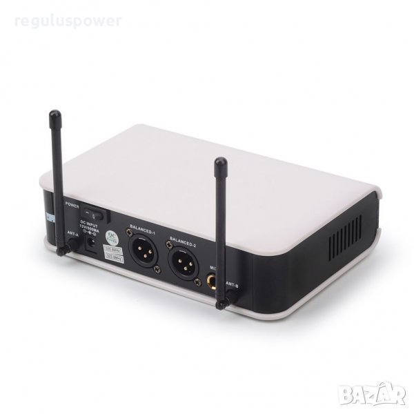 Гръб на приемника: копче за ВКЛ./ИЗКЛ., интерфейс за захранване, два XLR индивидуални изхода и един 1/4"" Mixed output