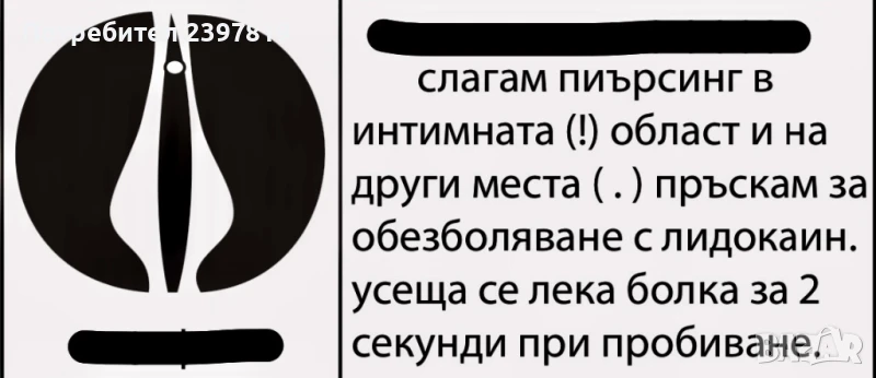 Слагам пиърсинг в интимната област (|) , ( . ) и на други места. Пръскам за обезболяване с лидокаин. Боли леко :) подарак прическа.
