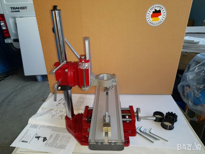 Комплекта включва: Стойка; маса; фиксатори за детайли; различни вложки за монтиране на шлайф/дрелка; ключове; ръководства;