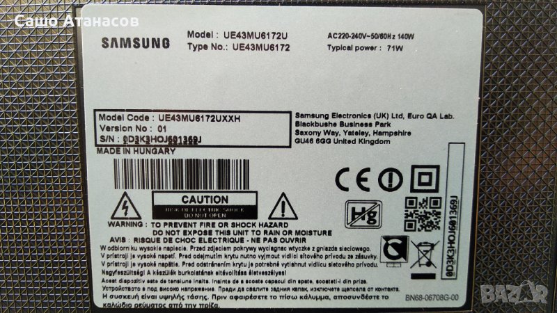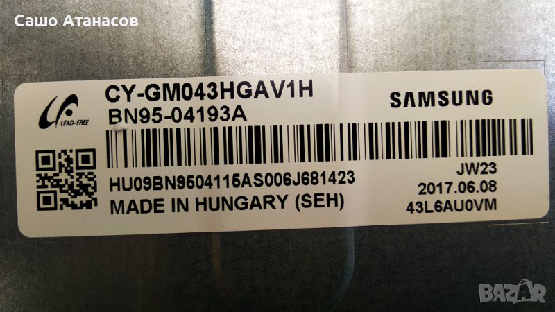 SAMSUNG UE43MU6172U със счупена матрица ,BN44-00806A ,BN41-02568A ,CY-GM043HGAV1H ,WCM730Q ,KU6000