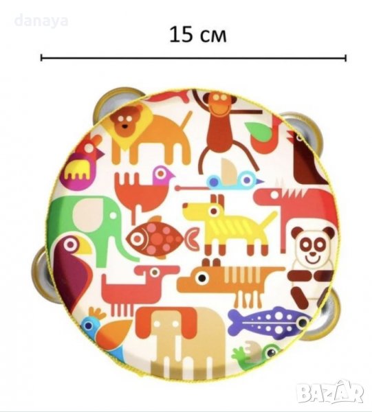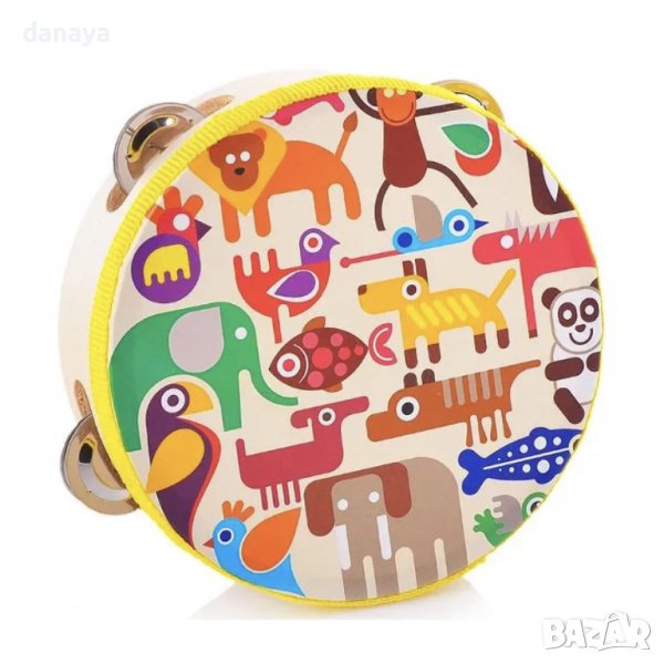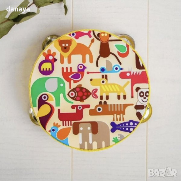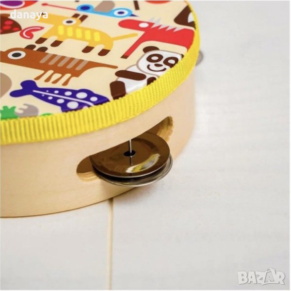 Детско дървено дайре с принт на весели животни. Ритмичен музикален инструмент за деца детско дайре. Музикална играчка дайре, което ще развие чувството за ритъм и такт и детето ще открие очарованието на музиката.