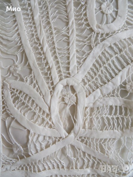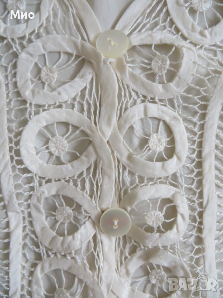 Изящна жилетка от естествена коприна. На етикета пише номер 36, но според мен, става за размери S, M и L. Бяла на цвят, но не снежно бяло, а с цвета на естествената коприна. Прав силует, с коланче за пристягана на гърба. Цепки отстрани. Ширина на раменете 36 см. Ширина под мишниците 51 см. Дължина на гърба 54 см. Без етикет.