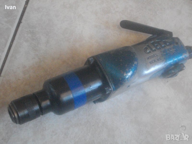 ОПИСАНИЕ пневматична реверсивна отвертка/прав шлайф - професионален. НЕ Е НАЛИЧЕН. Марка и модел CLEDO Model WL-200. Производство - оригинално САЩ - упоменато на машината - HOUSTON TEXAS.Абсолютно твърда цена - 109 лв, не подлежи на никакъв коментар. Алуминиев корпус на машината, предна част след корпуса и глава - закалена инструментална стомана. Дължина на машината - 275 мм. Отзад е с подтавена оригинална бърза връзка за скачване с компресор. Глава отпред - инструментална закалена стомана, тип "Звезда" - размер за поставяне на накрайник - 15 мм диаметър - торс/камък. Реверс ключ отдоле на машината за превключваве ляво/дясно.