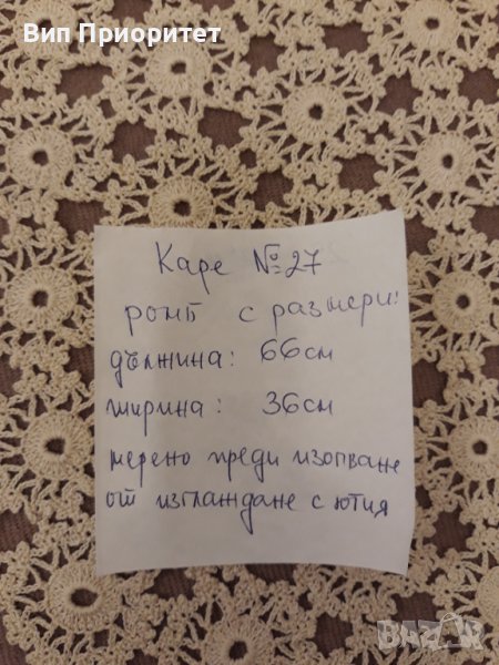 Каре № 27 ръчна изработка, от качествено макраме , плетено НА ЕДНА КУКА , а не на пет куки , изключително ПРЕЦИЗНА ИЗРАБОТКА, УНИКАЛНА МАЙСТОРСКА декорация. Размерите са както са посочени на снимката и са взети преди да е изопнато от гладене с ютия. Дължина 69 см , ширина 36 см преди да е опънато.