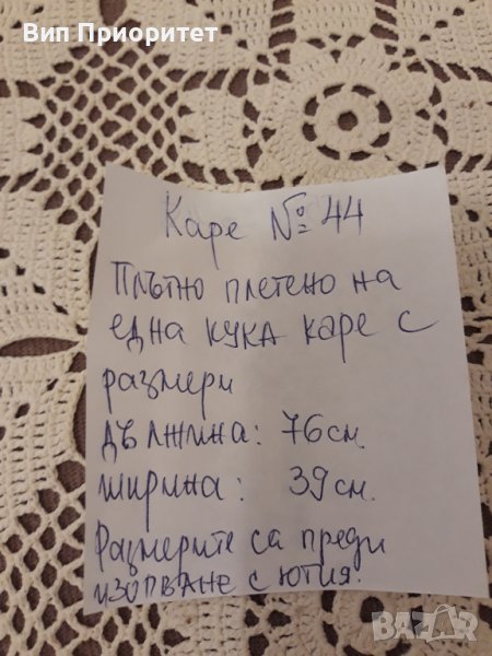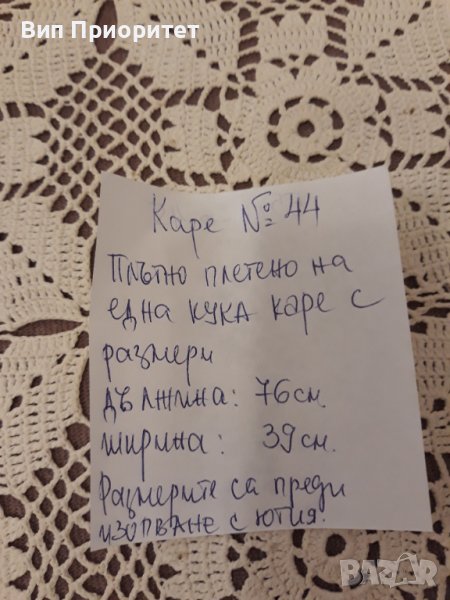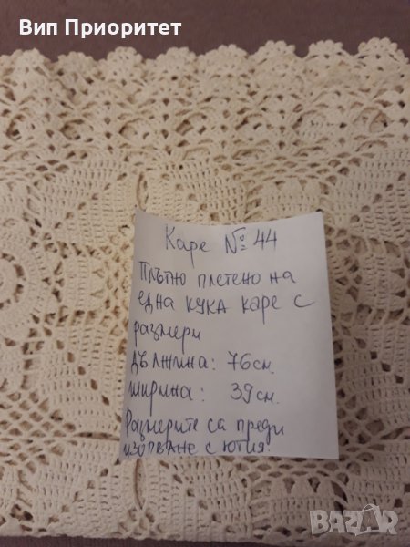 Каре № 44 ръчна изработка, от качествено макраме , плетено НА ЕДНА КУКА , а не на пет куки , изключително ПРЕЦИЗНА ИЗРАБОТКА, УНИКАЛНА МАЙСТОРСКА декорация. Размерите са както са посочени на снимката и са взети преди да е изопнато от гладене с ютия. Дължина 76 см , ширина 39 см. преди да е опънато. Карето е много хубаво , пракрасна декорация.