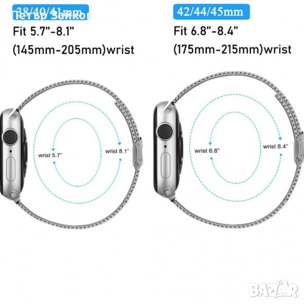 МНОГО РАЗМЕРА- 38/40/41 мм: Подходящ за 5,7" - 8,1" (145 мм-205 мм) китки; 42/44/45 mm: пасва на 6,8" - 8,4" (175mm-215mm) китки; На тази лента няма големи и малки размери. (Преди да купите, проверете НОМЕРА НА МОДЕЛА НА ЧАСОВНИКА на гърба на часовника, който носите.)