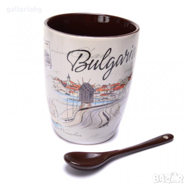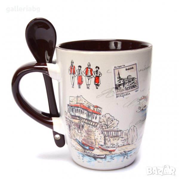 Сувенирна керамична чаша за топли напитки с лъжичка. Чашата е декорирана със забележителности от страната, хора в носии и надпис Bulgaria.
