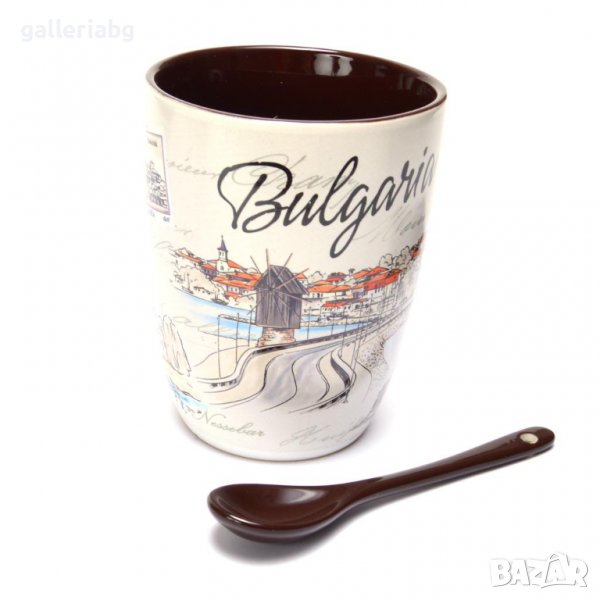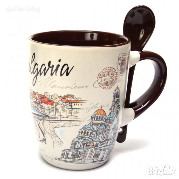 Сувенирна керамична чаша за топли напитки с лъжичка. Чашата е декорирана със забележителности от страната, хора в носии и надпис Bulgaria.