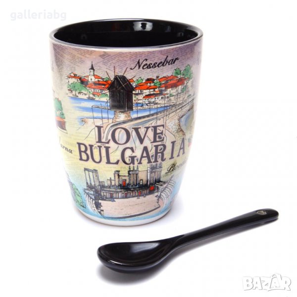 Сувенирна керамична чаша за топли напитки с лъжичка. Чашата е декорирана със забележителности от страната и надпис Love Bulgaria.