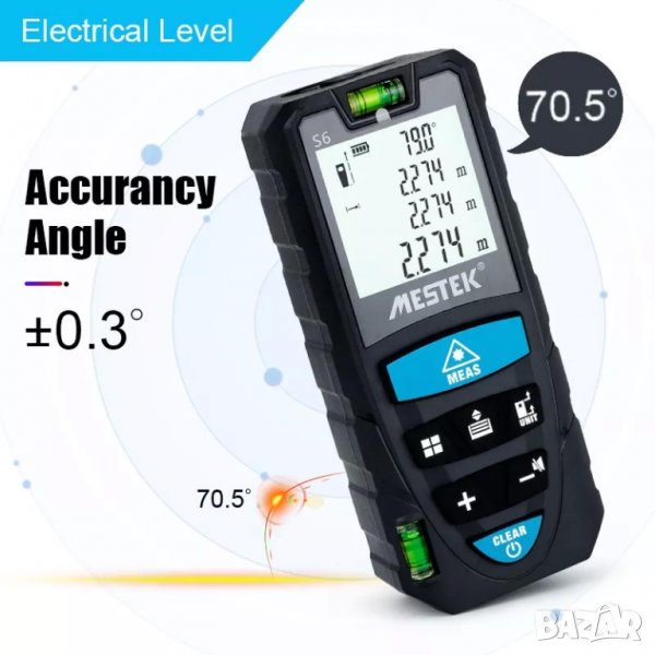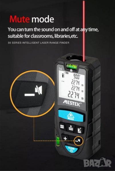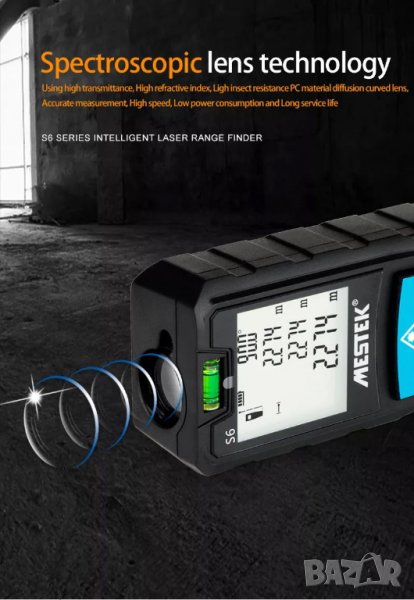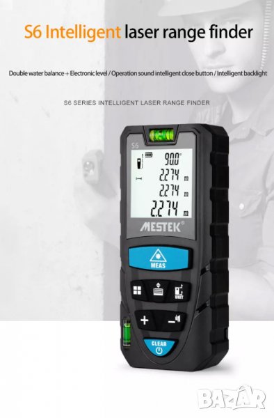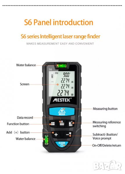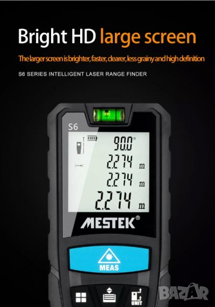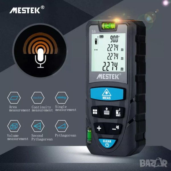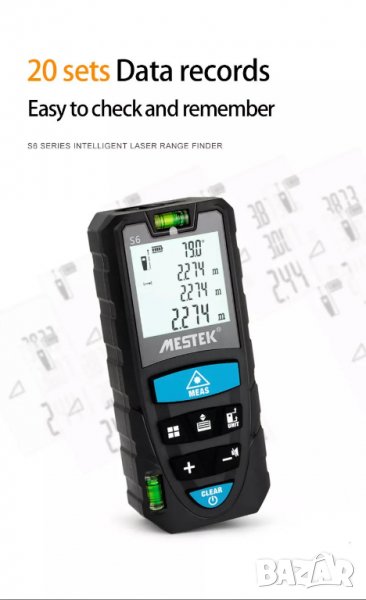 Лазерният измервател на разстояния Mestek S6 е изключително точен измервател на разстояния в диапазона от 0,2 м до 50 м. Този модел поддържа изчисления на площ, обем, питагорова теорема и др. въз основа на измерените стойности. Всичко се показва на голям дисплей с HD подсветка.